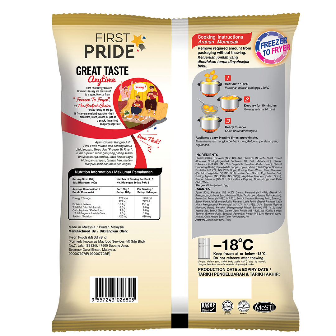 Ayam (90%), Pemekat (INS 1420), Garam, Penstabil (INS 451i), Ekstrak Yis (Mengandungi Minyak BungaMatahari Tidak Terhidrogen, Garam, Maltodekstrin), Penambah Perisa (INS 627, INS 631), Serbuk Sayuran(Bawang Putih, Bawang), Bahan Perisa Asli (Bawang Putih), Rempah (Lada Putih), Ekstrak Rempah (Lada HitamMengandungi Pengemulsi INS 471, INS 1520), Gula, Salutan [Tepung (Gandum, Beras), Pemekat ((MengandungiMinyak Sayuran) INS 1412), Kanji Jagung Asli, Serbuk Telur, Garam, Agen Penaik (INS 450(i), INS 500(ii)), SerbukSayuran (Bawang Putih, Bawang), Penambah Perisa (INS 621), Rempah (Lada Hitam)], Olein Kelapa Sawit TidakTerhidrogen, Air.
